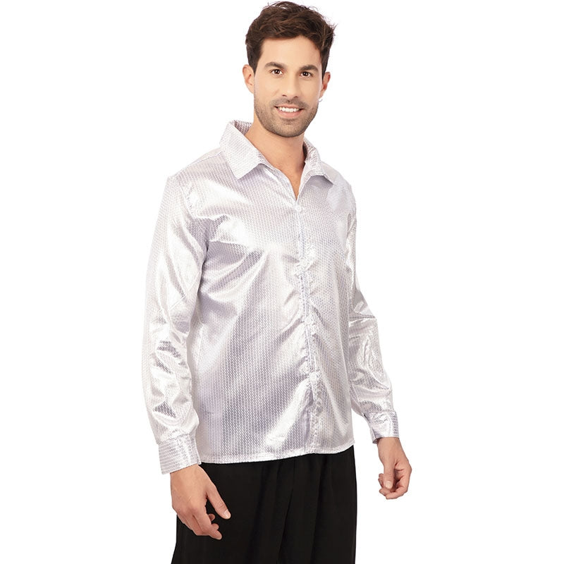 Procuras uma forma simples e económica de te destacares na tua próxima festa disco? Não procures mais! A nossa camisa prateada com lantejoulas é a escolha perfeita para brilhar na pista de dança e mergulhar no ambiente retro dos anos 70.
