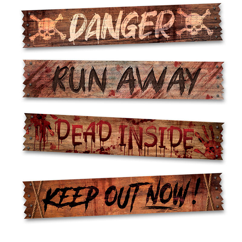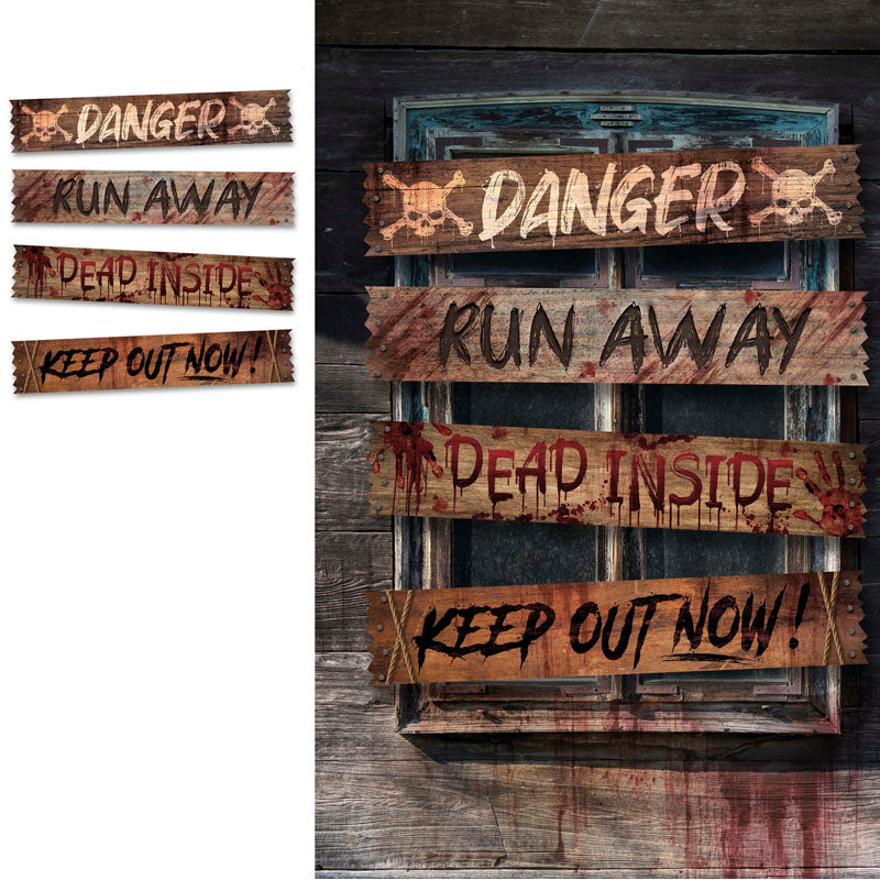 Pack de 4 cartazes para tapar janela (70x13 cm) com mensagens sangrentas e efeito madeira. Perfeitos para dar um ar apocalíptico à tua decoração de Halloween.