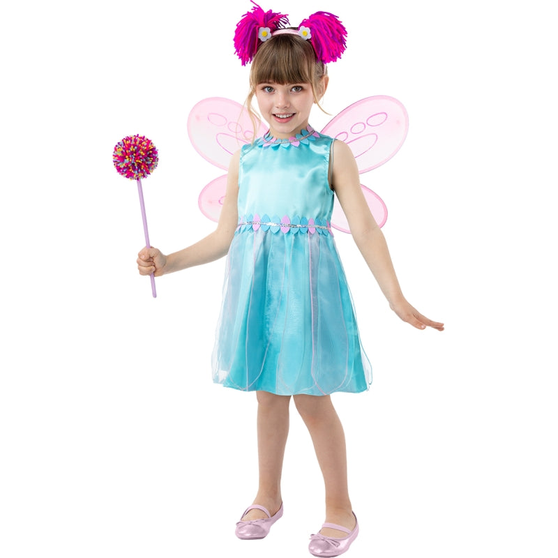 Disfarce oficial de Abby Cadabby para menina com vestido, asas, tiara e varinha. Disponível em 2 tamanhos. Doce, colorido e perfeito para festas infantis.