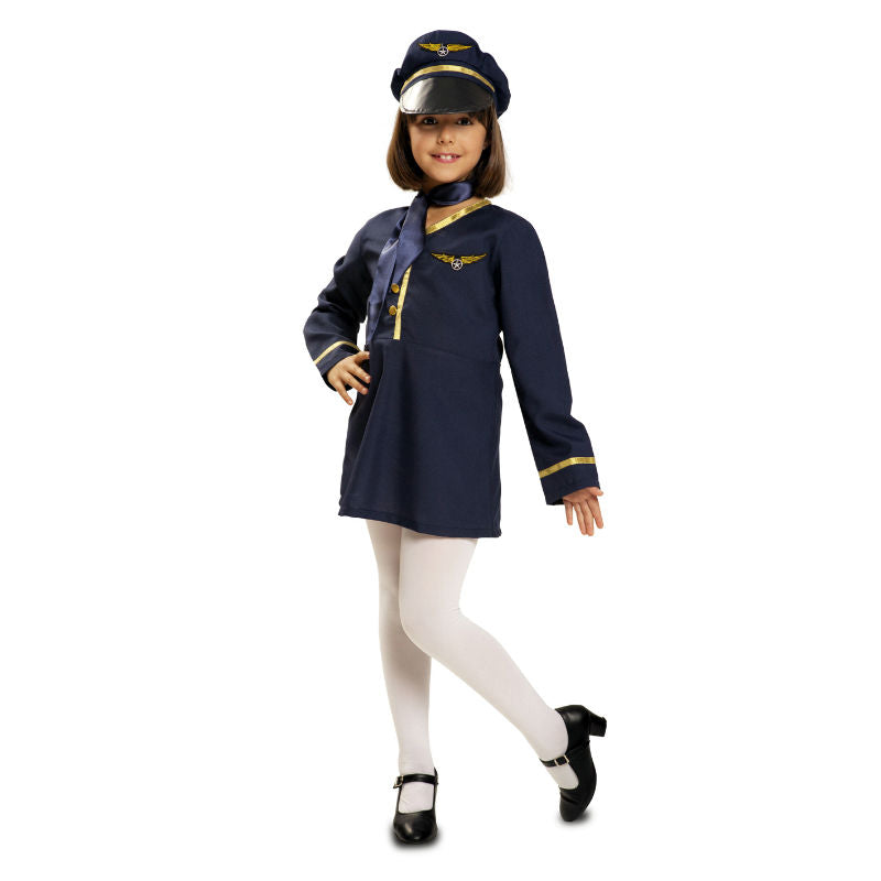 O traje de comissária de bordo para menina inclui: vestido, foulard e chapéu.