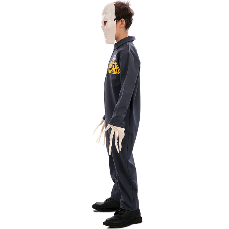 O fato inédito Alien da Área 51 para meninos inclui: fato-macaco, luvas, máscara | Este disfarce de Extraterrestre da Área 51 para crianças está disponível em 2 tamanhos diferentes