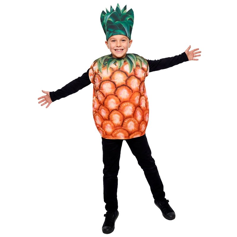 A fantasia original de Ananás Abacaxi para meninos e meninas inclui: Fato, gorro | Este traje infantil imitando Fruta de Verão está disponível em 2 tamanhos diferentes