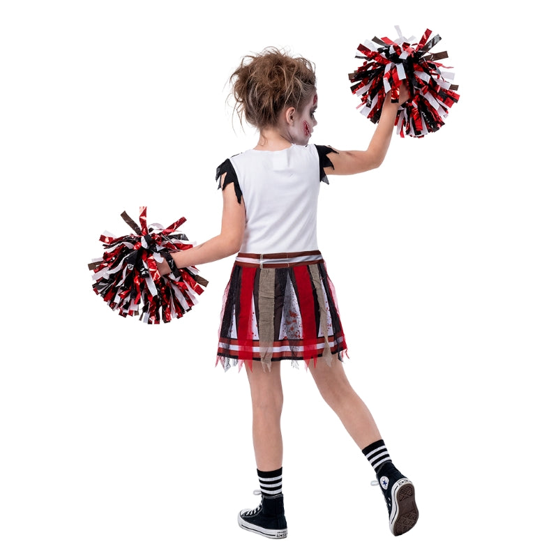 O fato Halloween Animadora Zombie Infetada para meninas inclui: Vestido, pompons, cinto | Este disfarce assustador Cheerleader Morta-Viva está disponível em 3 tamanhos diferentes