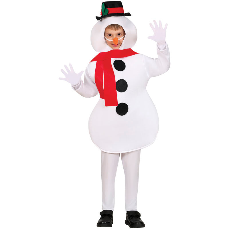 Fato de boneco de neve clássico para criança, incluindo fato com capuz e nariz (camisola branca não incluída). Disponível em 2 tamanhos. Este fantasia de boneco de neve para criança é uma escolha ideal para eventos escolares, festivais e celebrações familiares durante o Natal.