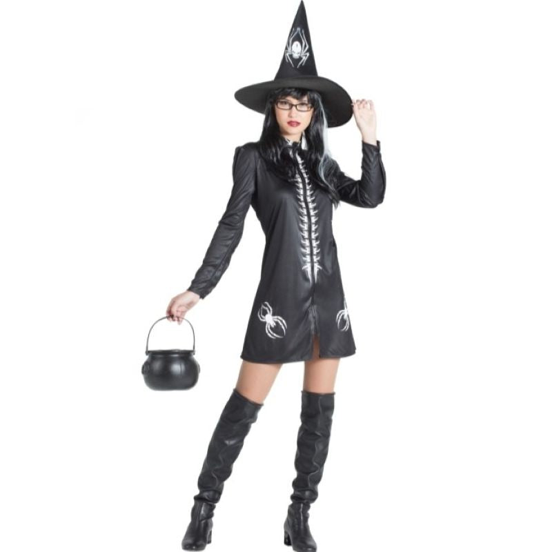 O fato Halloween Bruxa Aranha para mulheres inclui: Vestido com fecho frontal e chapéu | Este disfarce assustador mulher Feiticeira Aranha está disponível em tamanho único