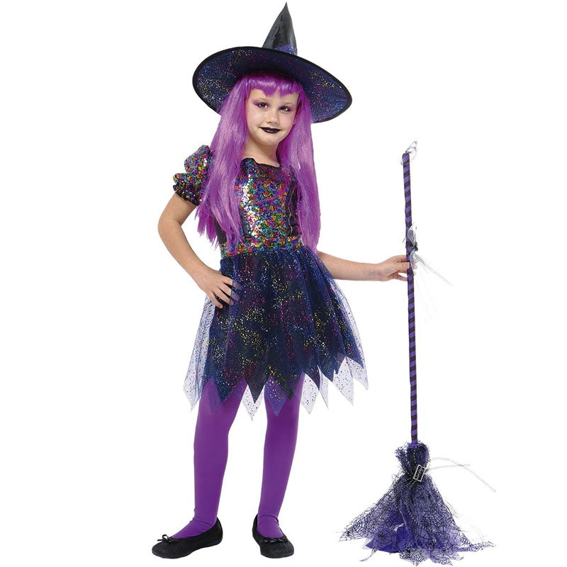 O fato Halloween Bruxa com lantejoulas para meninas inclui: vestido, chapéu e meias | Este disfarce assustador bruxa com lantejoulas multicoloridas está disponível em 3 tamanhos diferentes