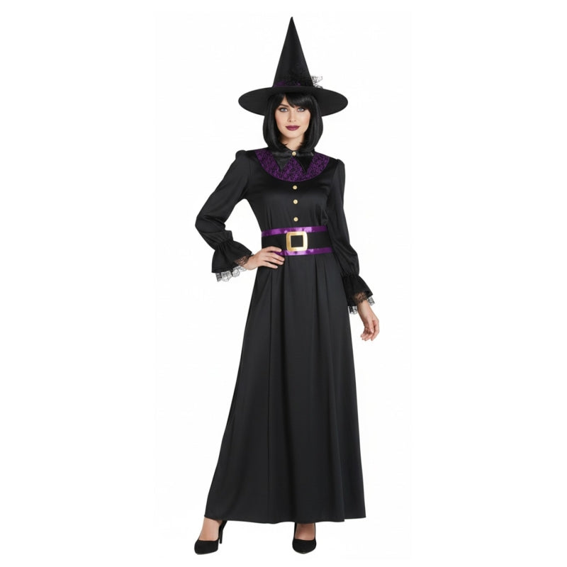 O fato Halloween Bruxa Samantha para mulheres inclui: Vestido, chapéu e faixa | Este disfarce assustador mulher Maga Misteriosa está disponível em 3 tamanhos diferentes