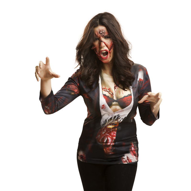 T-shirt adulto hiper-realista para se vestir como uma zombie na noite de Halloween ou festa de terror | A t-shirt zombie para mulher está disponível em 4 tamanhos diferentes.