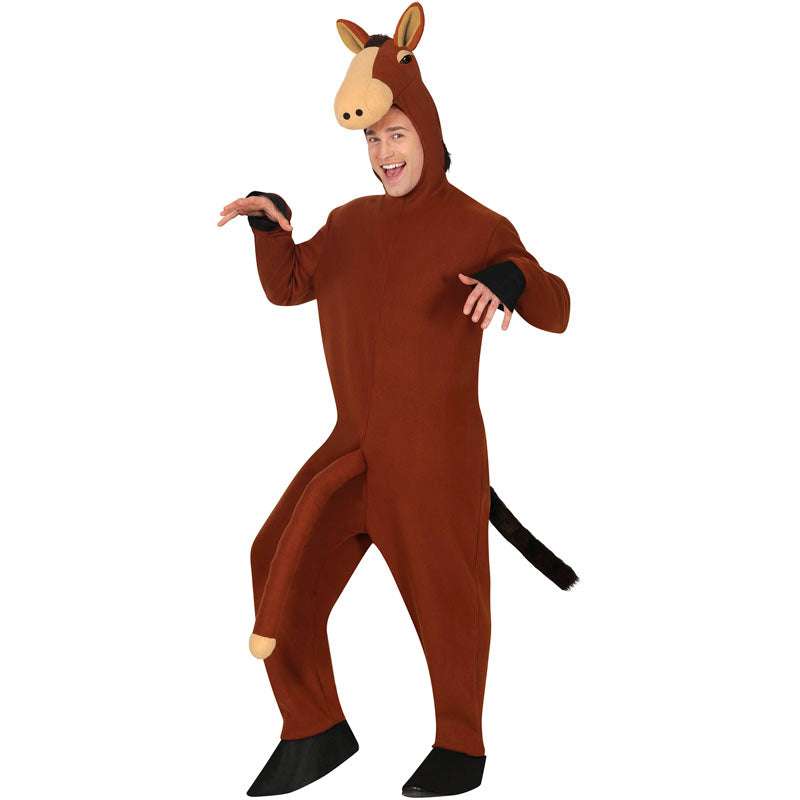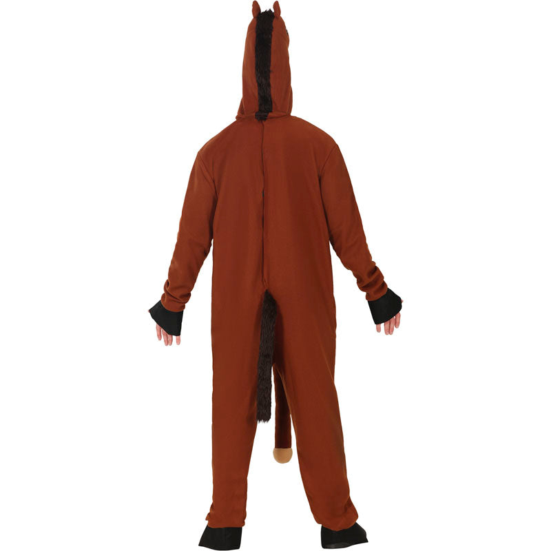 - Macacão marrom de cavalo com zíper e capuz com orelhas e focinho