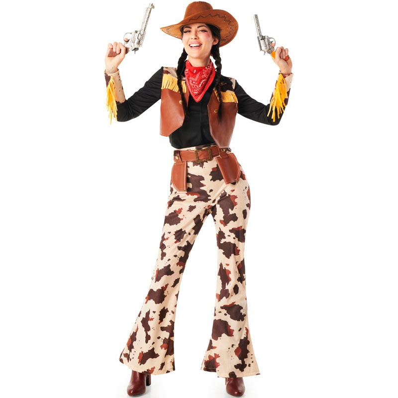 O fato original Cowgirl do rancho forte para mulheres inclui: colete, calças, cinto com cartucheiras, braçadeiras e lenço | Este disfarce mulher cowgirl rija do oeste está disponível em 4 tamanhos diferentes