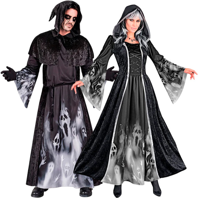 O fato de Almas que Gritam para homem inclui: túnica escura com capuz e cinto, enquanto o de mulher contém: vestido escuro com capuz integrado.