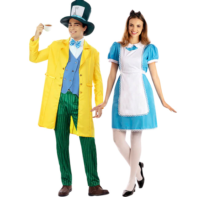 O disfarce de Chapeleiro Louco do filme Alice para homem inclui: chapéu, camisa com falso colete, casaco, calças e laço, enquanto o disfarce de Princesa Alice para mulher contém: vestido com avental e tiara.