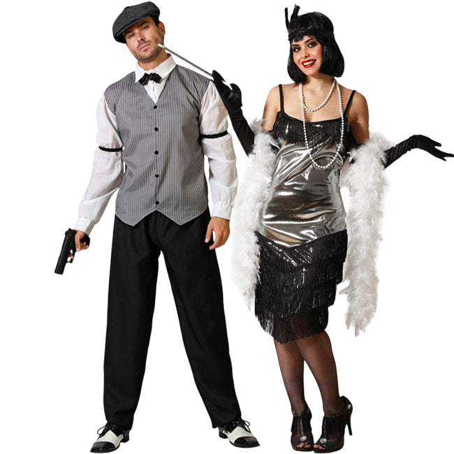 O fato de Gánster cinzento para homem inclui: camisola e calças, enquanto o de Cabaré prateado para mulher contém: vestido.