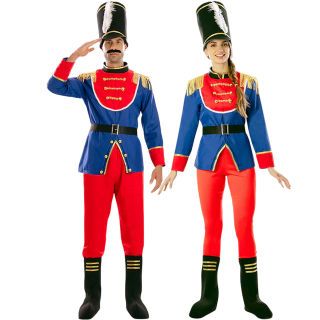 Casal com trajes de soldadinhos Quebra-Nozes, uniformes elegantes inspirados no famoso bailado.