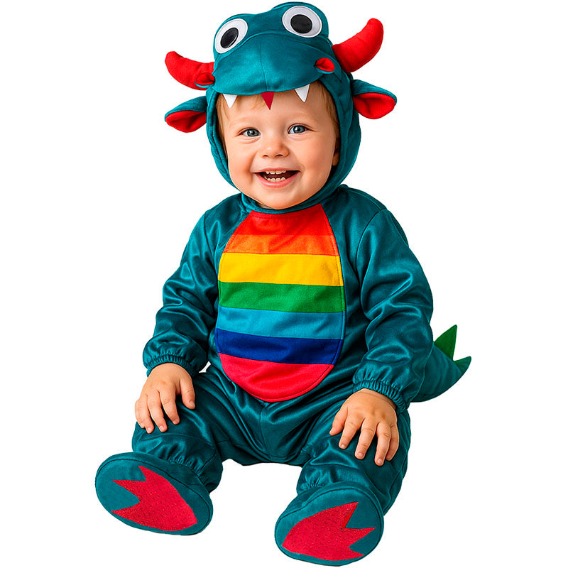 O fato inédito Dragão colorido para bebés inclui: Macacão, capuz e protetor de sapatos | Este disfarce de Dragão fofo para bebés está disponível em tamanho unico