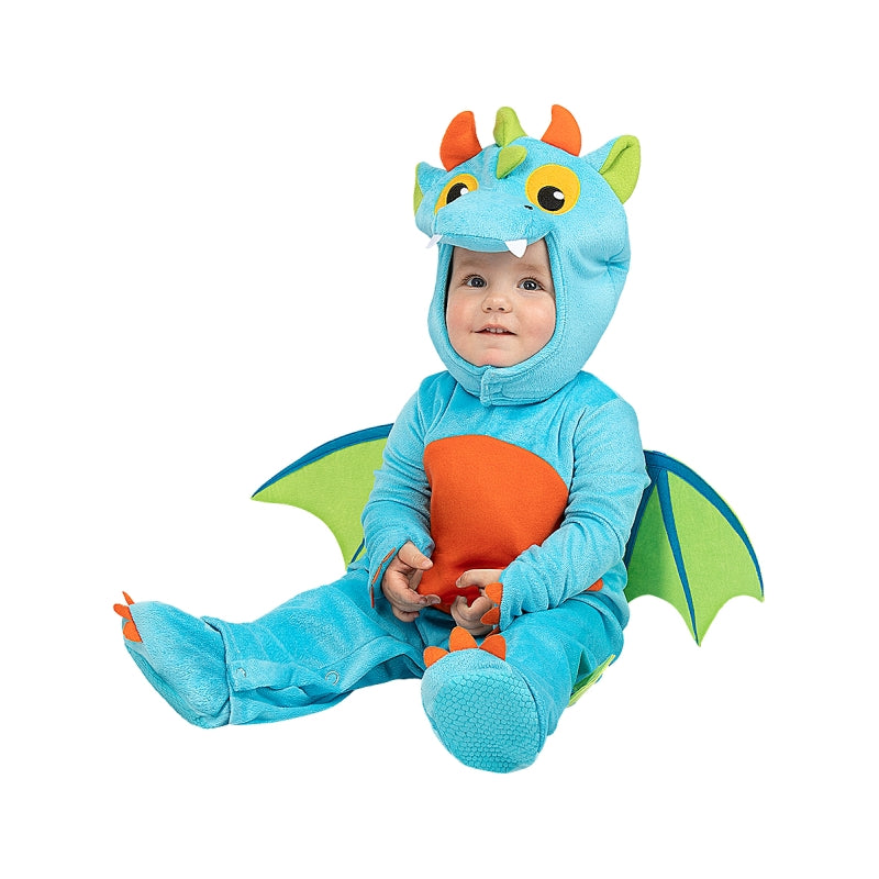 A fantasia original para bebês de Dragão Azul com asas inclui: macacão com molas, cobre-pés, gorro, cauda e asas | Este fato exclusivo para bebês, imitando um Dragão azul com asas mágicas, está disponível em 3 tamanhos diferentes.