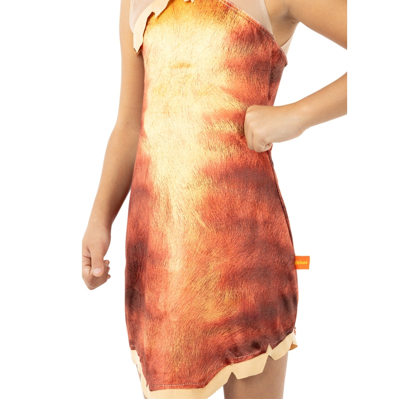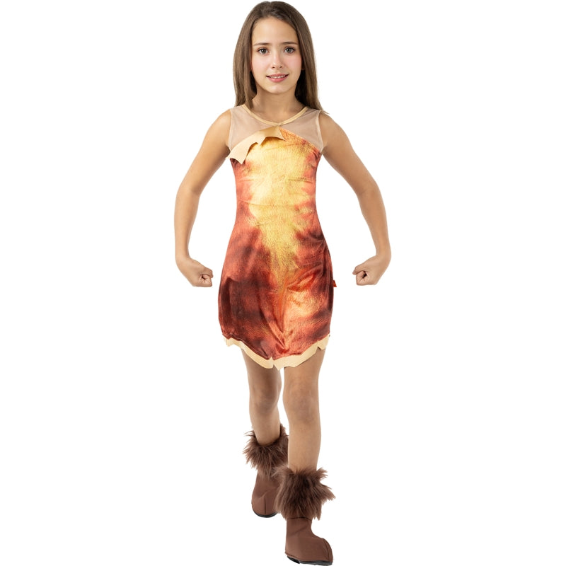 Disfarce oficial de Eep de Os Croods para menina com vestido e cobre-botas. Disponível em 4 tamanhos. Peruca não incluída. Ideal para aventuras pré-históricas.