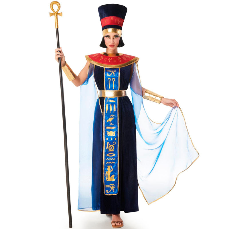 O fato original Egípcia em veludo azul para mulheres inclui: chapéu, colar, túnica, capa, braceletes e cinto | Este disfarce mulher Dama egípcia azul-real está disponível em 5 tamanhos diferentes