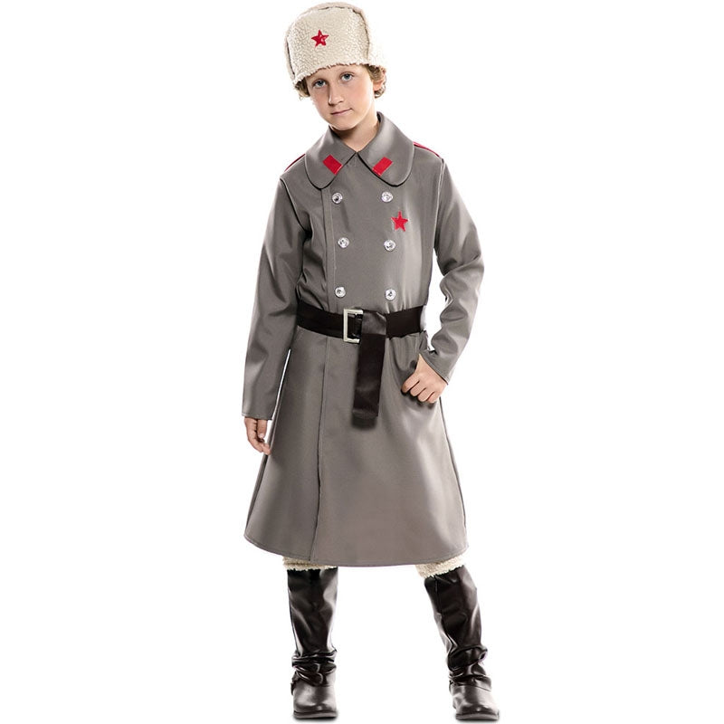 O fato de criança que imita um espião russo para menino inclui: casaco, capas de botas e chapéu | Este disfarce de espião militar soviético está disponível em 4 tamanhos diferentes