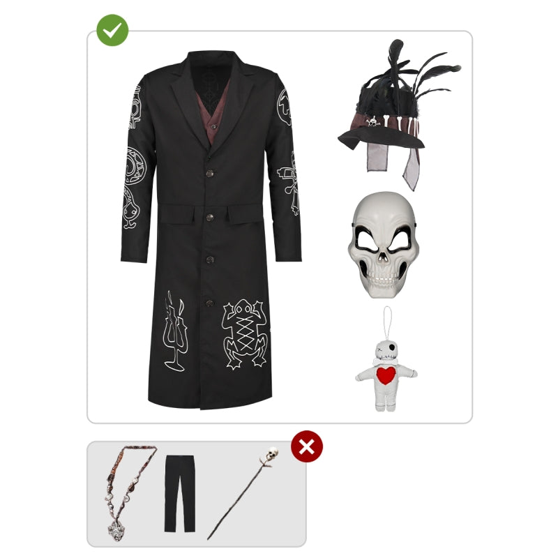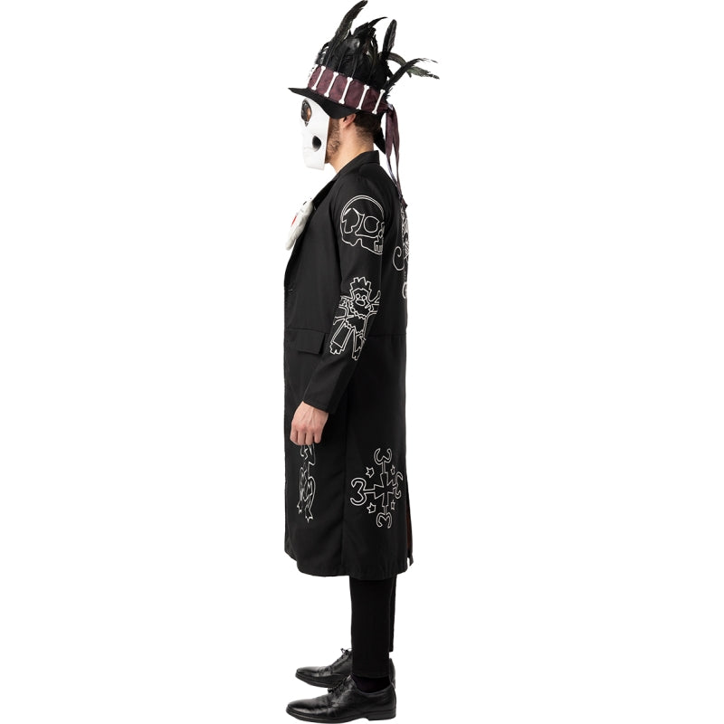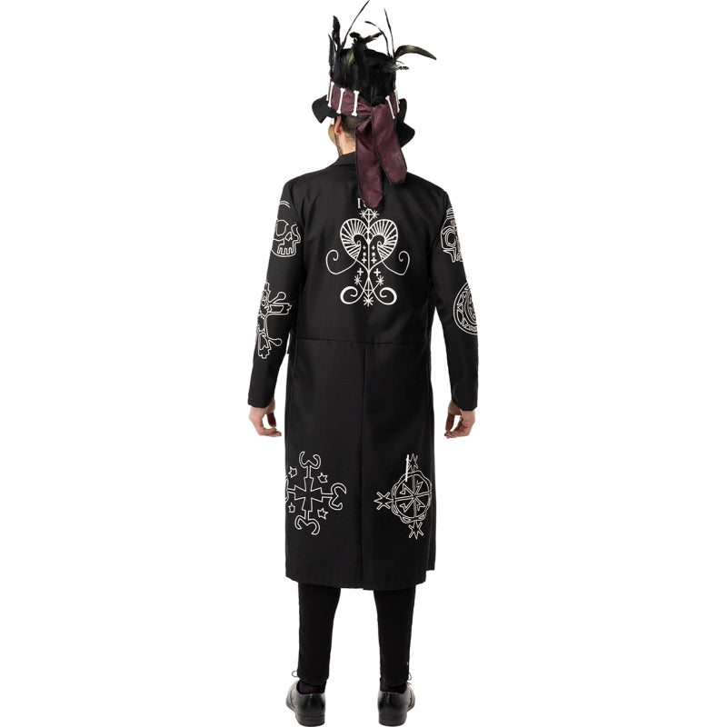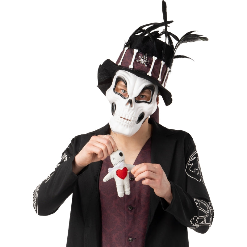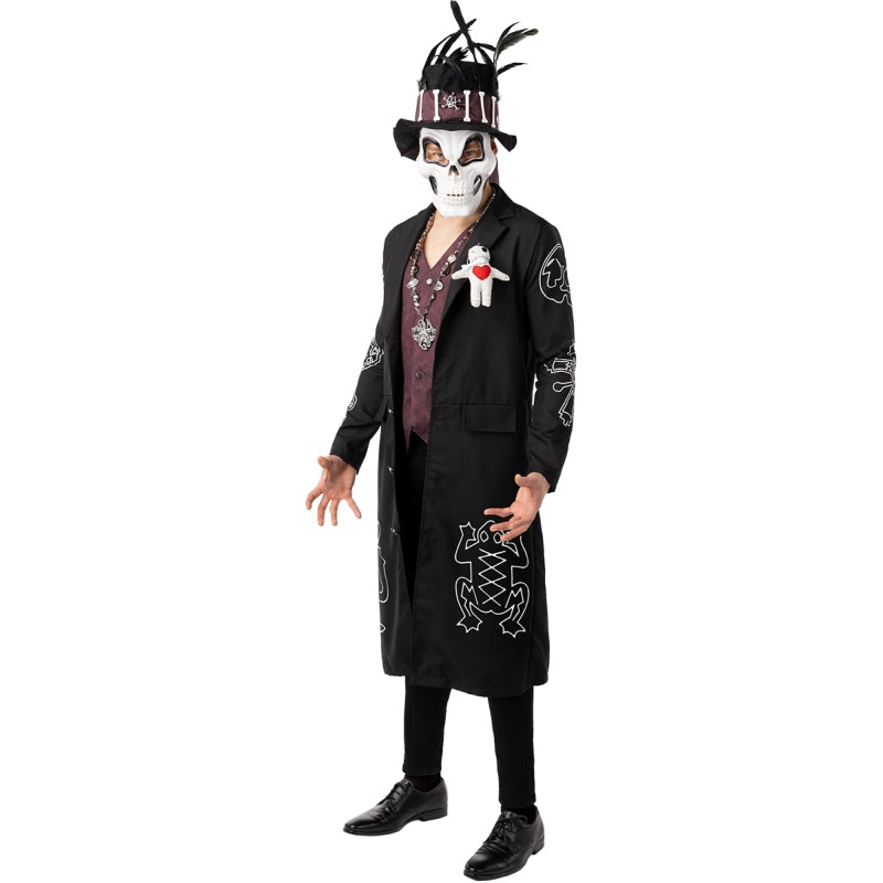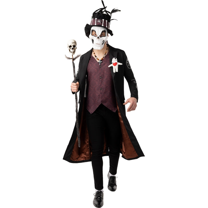 Disfarce de Esqueleto Vodu para homem com casaco, colete, boneco vodu, chapéu e máscara. Disponível em 3 tamanhos. Cajado não incluído. Ideal para festas assustadoras.