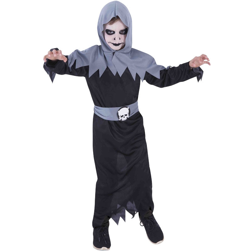 O fato Halloween Executor Cheapyweens para meninos inclui: túnica com capuz cinto de crânio | Este disfarce assustador para crianças a imitar verdugo de morte está disponível em 2 tamanhos diferentes