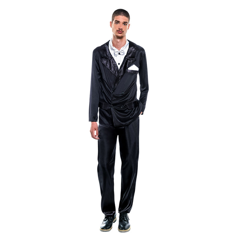 O traje adulto estilo O Grande Gatsby dos anos 20 para homem inclui: Camisa com gravata borboleta, calça e casaco.