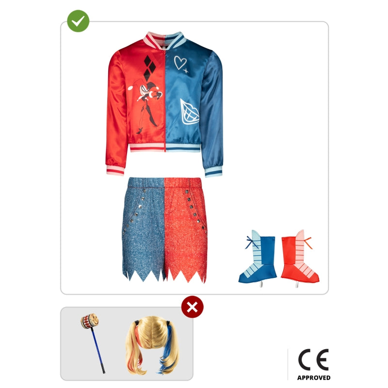 Disfarce oficial de Harley Quinn para menina com casaco, calças e cobre-botas. Disponível em 3 tamanhos. Peruca e martelo não incluídos. Ideal para brilhar em festas.