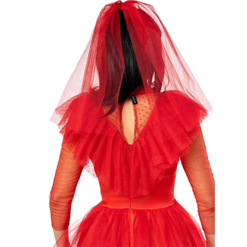 O fato Halloween Lydia Deetz Beetlejuice para mulheres inclui: vestido de noiva e véu vermelho e pertence ao merchandising oficial da Warner Bros | Este disfarce assustador mulher Lydia Deetz, a noiva gótica de Beetlejuice está disponível em 3 tamanhos diferentes