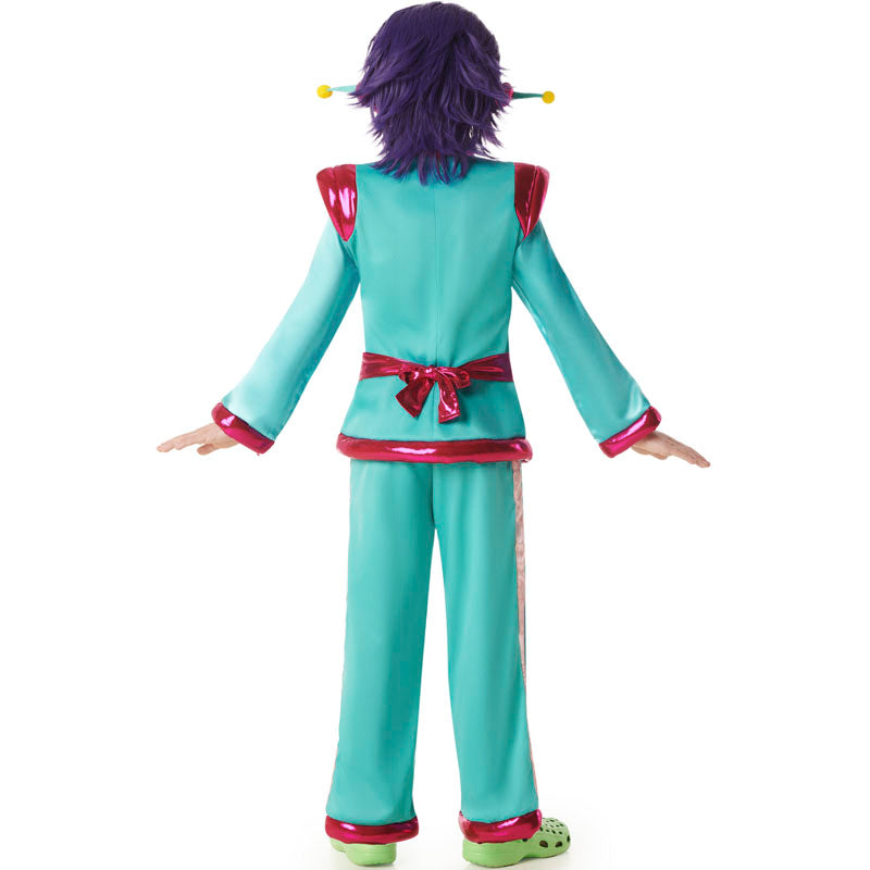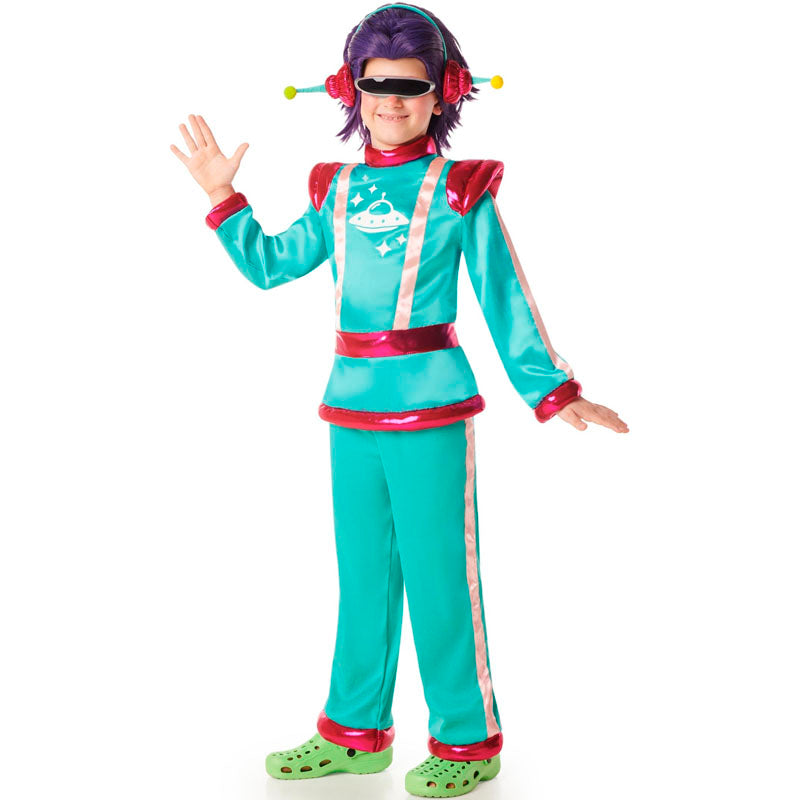 O fato inédito Marciano verde-turquesa para meninos inclui: diadema, camisa e calças | Este disfarce de alien azul-esverdeado para crianças está disponível em 4 tamanhos diferentes