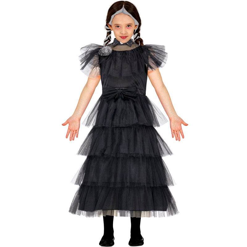 O fato Halloween Menina Gótica Baile para meninas inclui: vestido | Este disfarce assustador Menina gótica da família mais sombria de toda a televisão está disponível em 3 tamanhos diferentes