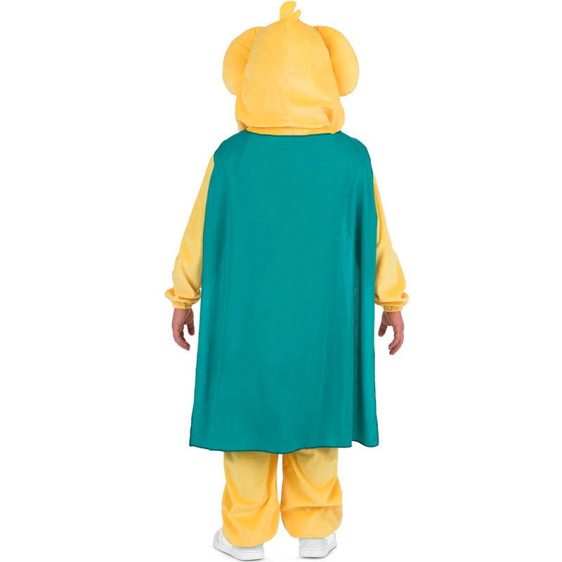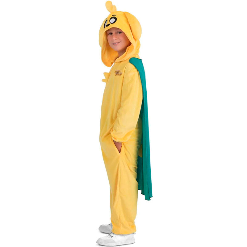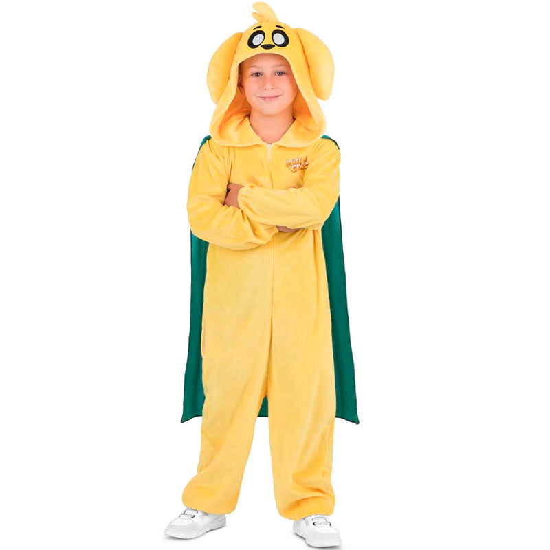 O fato exclusivo de Mike de As Aventuras de Mikecrack para crianças inclui: macacão com capuz e capa | Este fato infantil imitando Mike, o cão orelhudo com pelo amarelo e um casaco turquesa. está disponível em 4 tamanhos diferentes.
