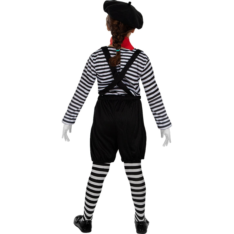 O fato original Mimo para meninas inclui: Jardineira, t-shirt, boina e lenço | Este disfarce Mimo em preto e branco para crianças está disponível em 4 tamanhos diferentes