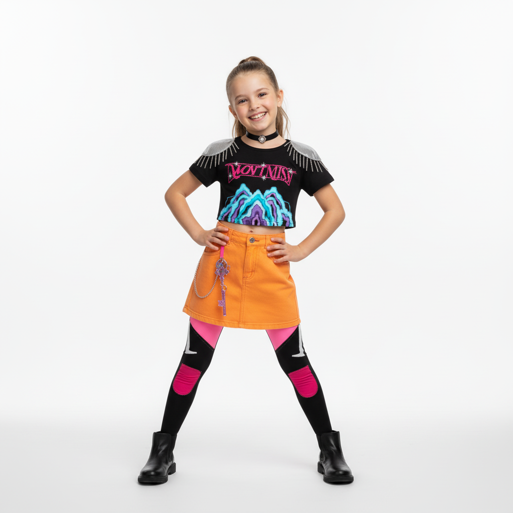 O fato original Mira do K-Pop para meninas inclui: Top, saia e leggings | Este disfarce Mira a guerreira Kpop das Demon Hunters para crianças está disponível em 4 tamanhos diferentes