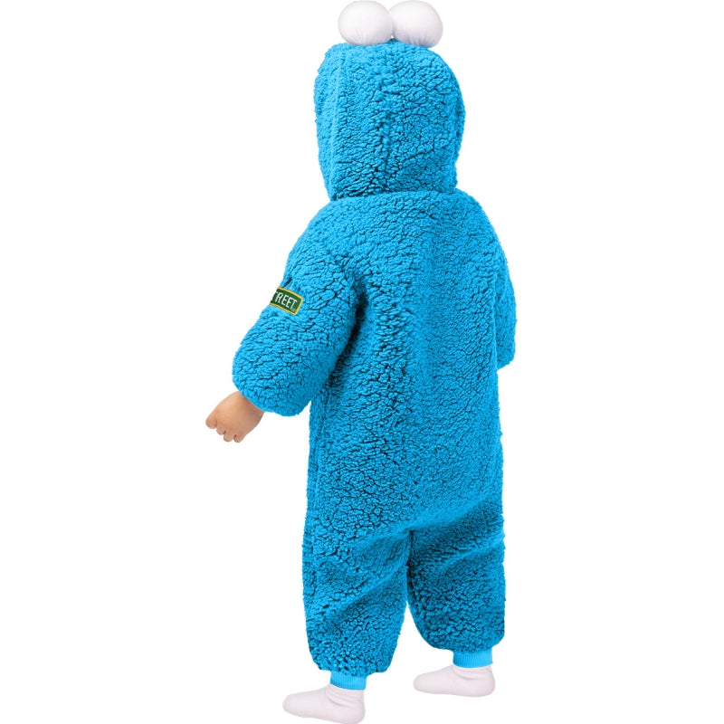 - Macacão azul com textura suave e capuz com os olhos do Monstro das Bolachas