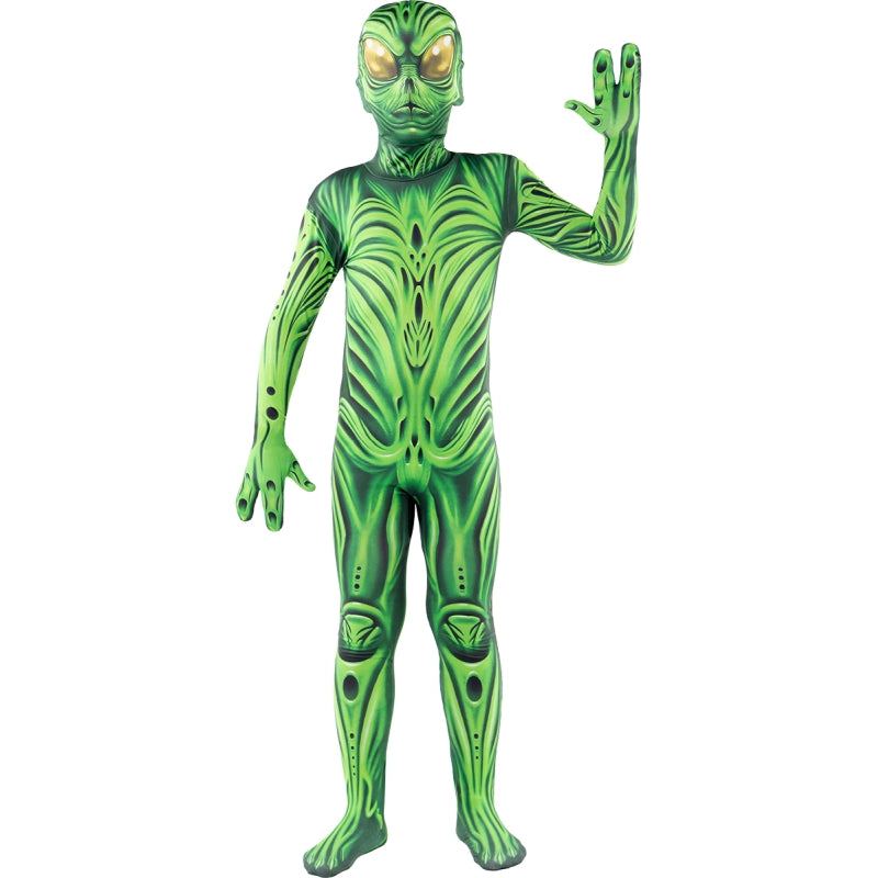 Disfarce de Monstro Extraterrestre para criança com fato completo e abertura nas costas. Disponível em 3 tamanhos. Confortável e divertido, perfeito para Carnaval ou festas temáticas.