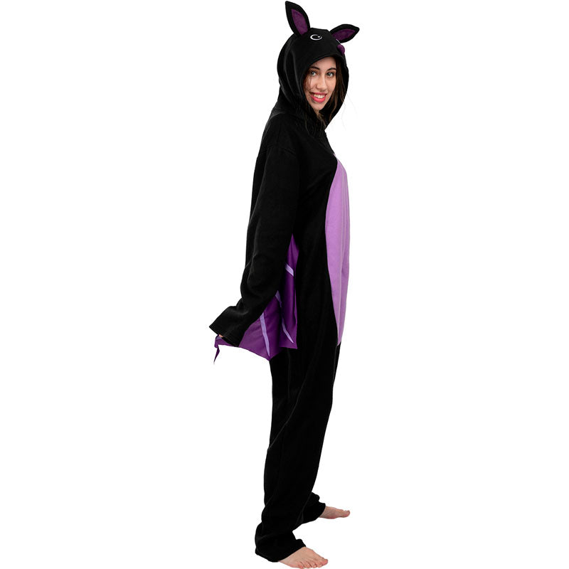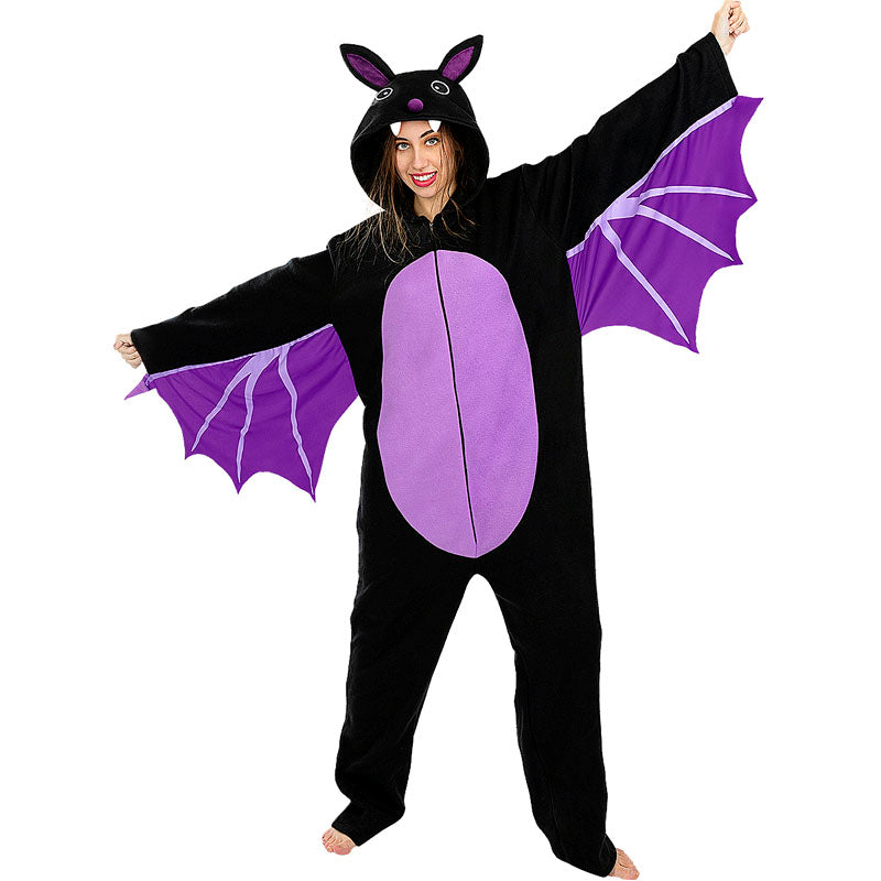 O novo fato de Morcego com asas para adultos contém: Macacão com capuz e asas | Este fato exclusivo, que servirá tanto para homens quanto para mulheres, imitando Morcego preto e roxo, está disponível em 3 tamanhos diferentes.
