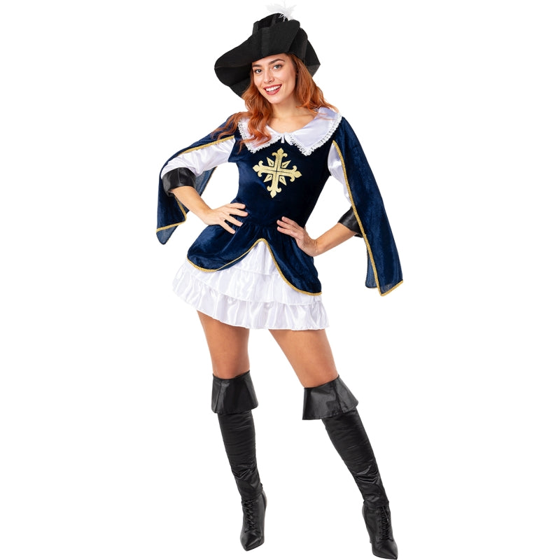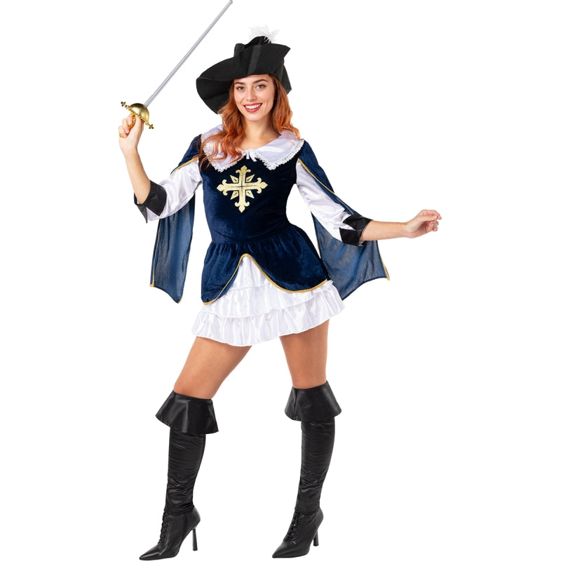 Este exclusivo disfarce de Mosqueteira da Ordem para mulheres contém: Vestido, chapéu e cobre-botas | Este traje de mulher para se transformar em espadachim real do antigo reino francês está disponível em 4 tamanhos diferentes