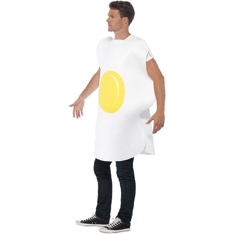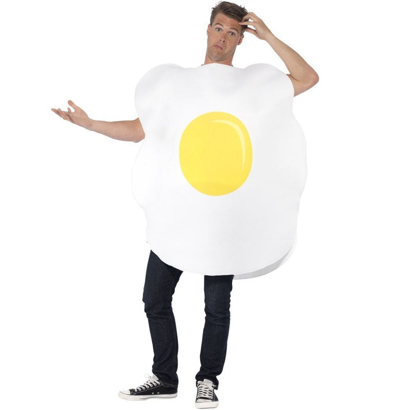 O traje de ovo frito para adultos inclui: Peitoral em forma de ovo | A fantasia de ovo frito adulto está disponível em tamanho único