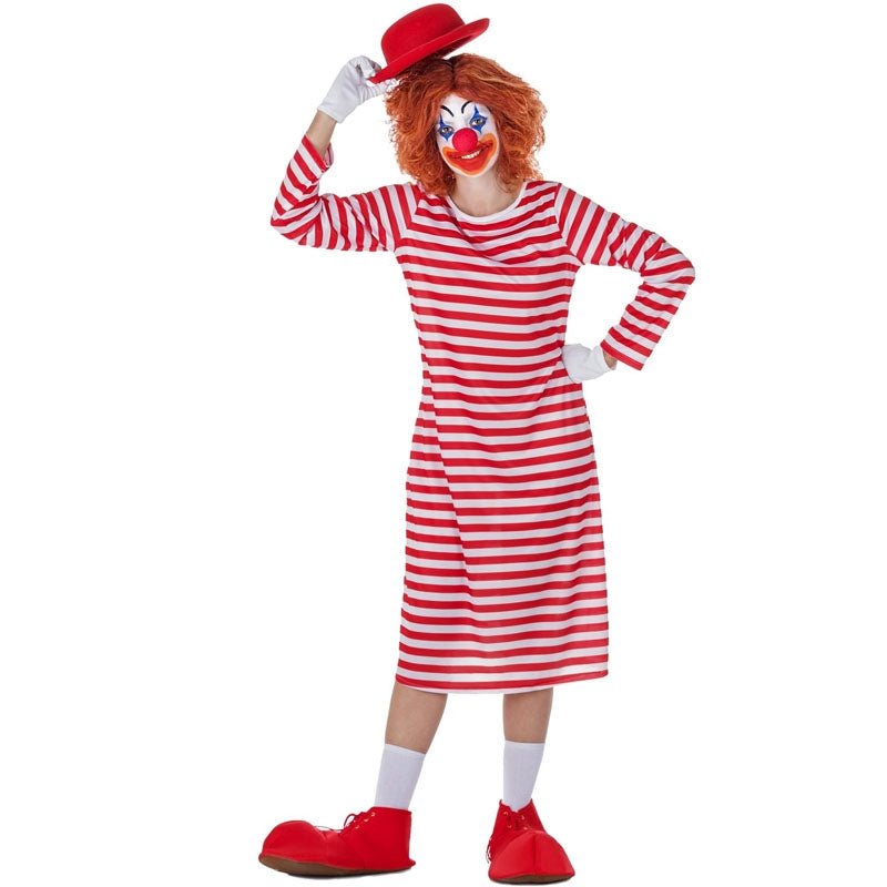 O traje adulto imitando um palhaço listrado branco e vermelho para as mulheres inclui: chapéu, nariz, camisola, capa de sapato | Este fato de palhaço às riscas está disponível em 3 tamanhos diferentes