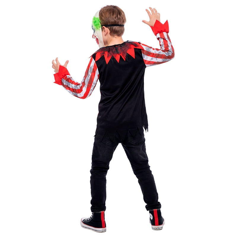 O fato Halloween Palhaço Smily Killer para meninos inclui: T-shirt, máscara | Este disfarce assustador para crianças a imitar Palhaço Macabro Sorridente está disponível em 3 tamanhos diferentes