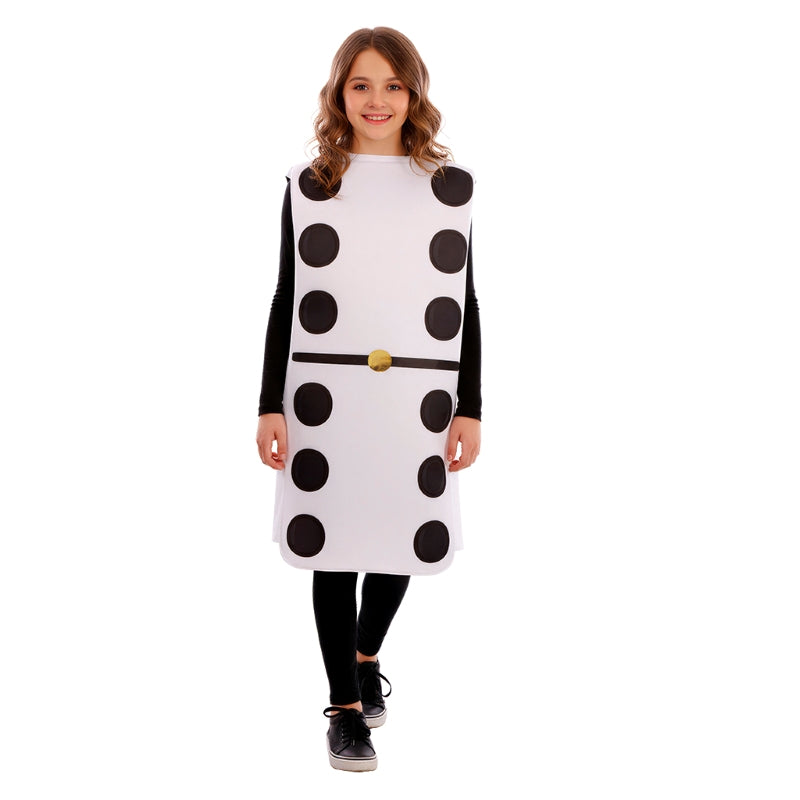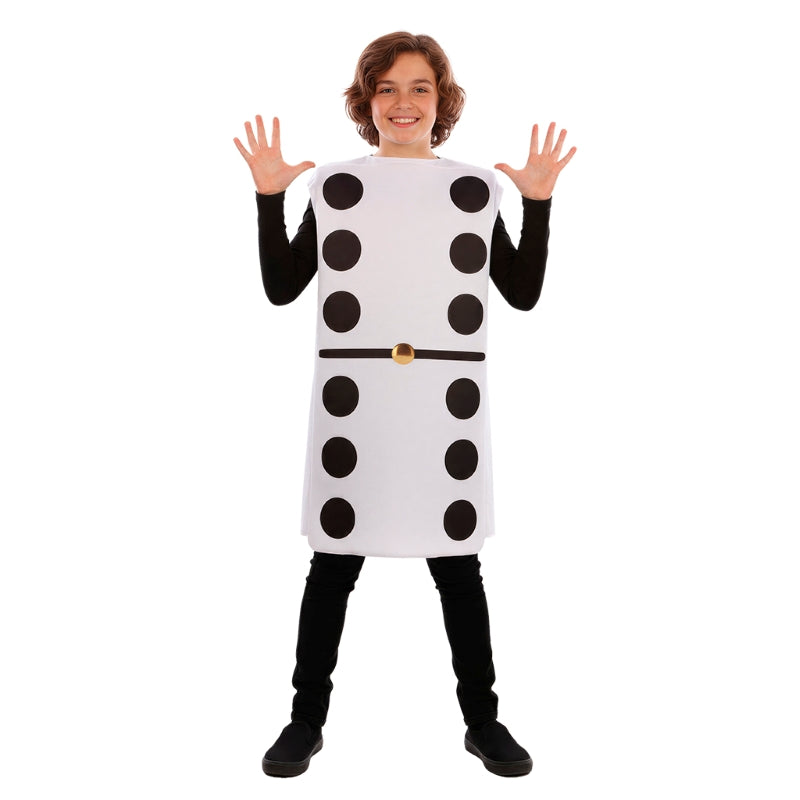 A fantasia original de Peça Dominó 6x6 para meninos e meninas inclui: Fato | Este traje infantil imitando Dominó Duplo Seis está disponível em 2 tamanhos diferentes