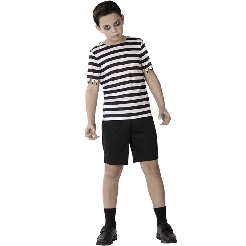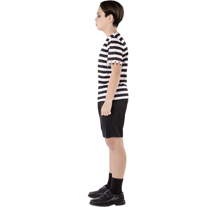 O fato Halloween Pugsley Addams com mangas curtas para meninos inclui: T-shirt e calças | Este disfarce assustador para crianças a imitar Pugsley, o filho rechonchudo dos Addams está disponível em 4 tamanhos diferentes