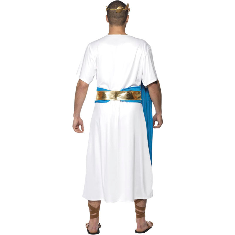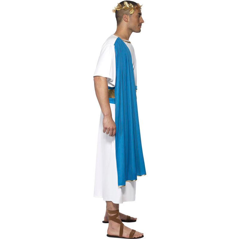 O fato inédito Senador romano capa azul para homens inclui: túnica, cinto e toucado | Este disfarce de patrício romano para adultos está disponível em 2 tamanhos diferentes