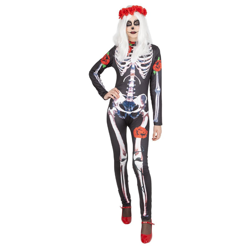 Dentro da nossa seleção aterradora de fatos de Halloween, acabámos de acrescentar um novo disfarce de terror para mulheres com o qual se pode transformar rapidamente numa Skelita Catrina com rosas aterradora usando este fato de Halloween para mulheres. Não perca a oportunidade de se vestir como Catrina com rosas com este fato de Halloween de tamanho adulto feminino que contém Macacão e diadema e está disponível em tamanho único. Este novo disfarce Esqueleto com rosas feminino é ideal para assustar toda a gente na sua próxima festa de fantasias assustadoras e faz parte do nosso extenso catálogo de fatos de Halloween para mulheres. Compre este original fato Skelita Catrina com rosas de mulher para Halloween para o transformar na noite mais escura do ano e terá o tempo da sua vida.