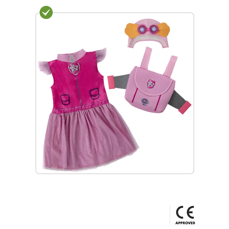 O fato original Skye Polícia - Patrulha Pata® para meninas inclui: Vestido, mochila e chapéu | Este disfarce Skye polícia – Patrulha Pata® para crianças está disponível em 2 tamanhos diferentes