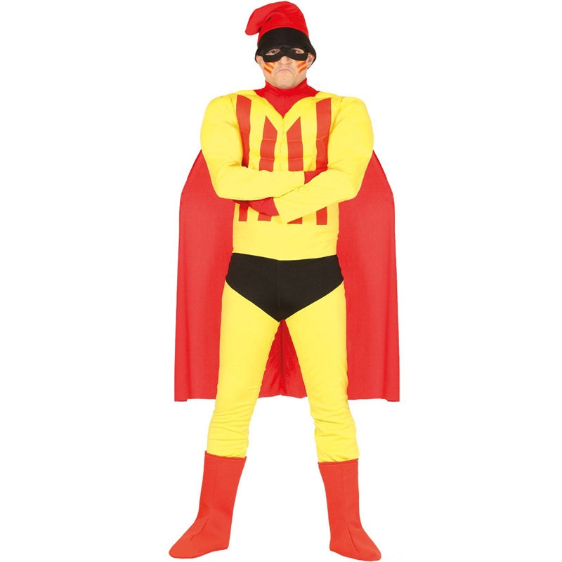 O simpático traje adulto do Supercat, o herói da independência inclui: Macacão, capa e barretina com máscara | O traje adulto de super-herói catalão está disponível em tamanho único