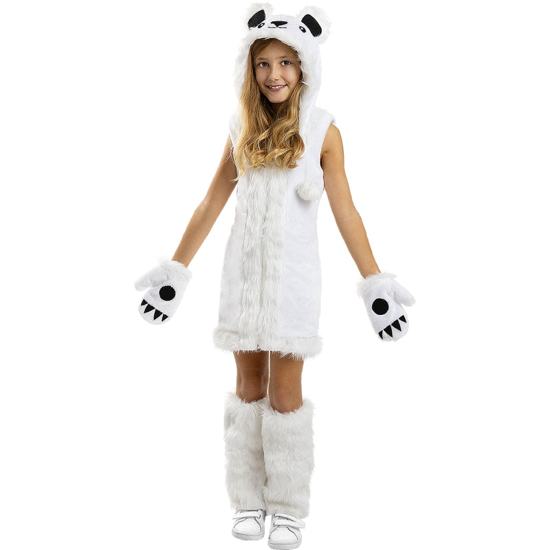 O fato original Urso Polar para meninas inclui: Vestido com capuz, luvas e cobre-botas | Este disfarce Urso polar branco do Ártico para crianças está disponível em 4 tamanhos diferentes