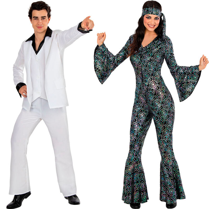 O fato Anos 70 de Febre de Sábado à Noite para homem inclui: blazer, camisa e calças, enquanto o fato Diva Disco Anos 70 para mulher contém: macacão e fita para a cabeça.