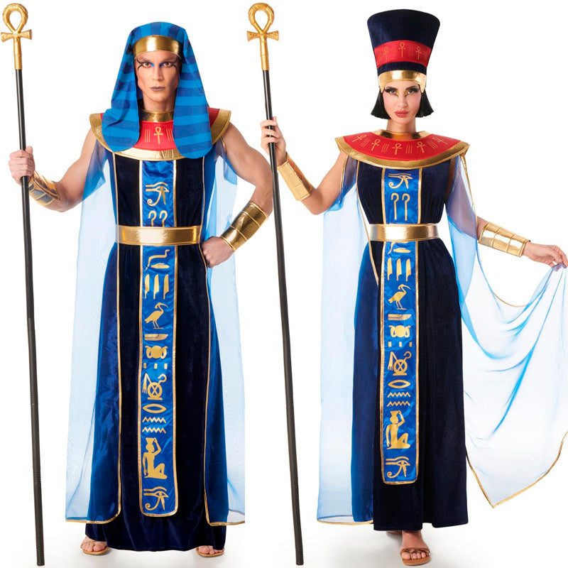 O fato Egípcio em veludo azul para homem inclui: toucado, colar, túnica, capa, braceletes e cinto, enquanto o fato Egípcia em veludo azul para mulher contém: chapéu, colar, túnica, capa, braceletes e cinto.