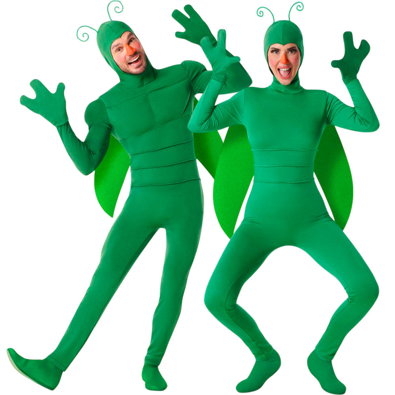 O fato Gafanhoto verde para homem inclui: capuz, macacão, asas e luvas, enquanto o fato Gafanhoto verde para mulher contém: capuz, macacão, asas e luvas.